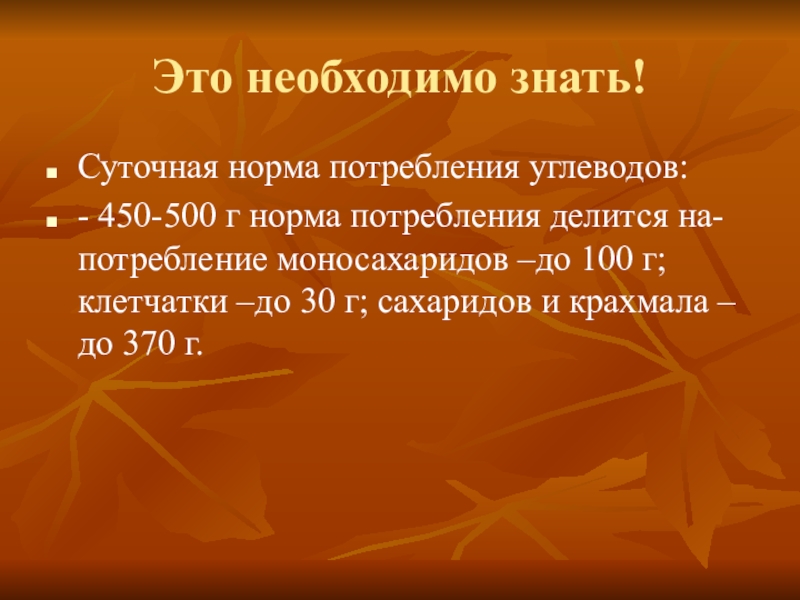на- потребление моносахаридов –до 100 г; клетчатки –до 30 г; сахаридов и крахмала – до 370 г.