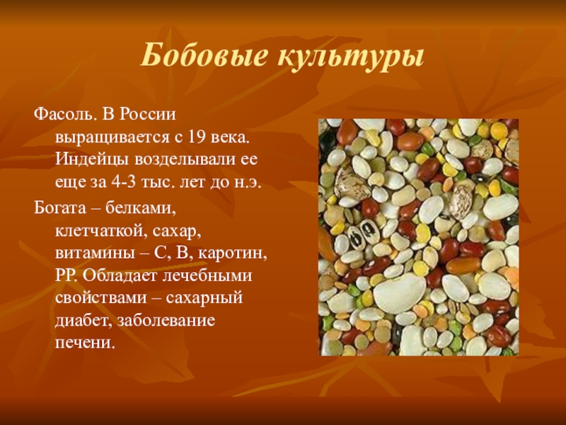 Фасоль. В России выращивается с 19 века. Индейцы возделывали ее