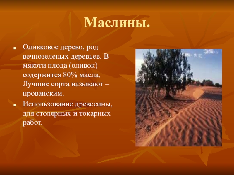 Оливковое дерево, род вечнозеленых деревьев. В мякоти плода (оливок) содержится 80%
