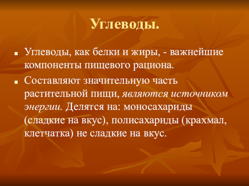 часть растительной пищи, являются источником энергии. Делятся на: моносахариды (сладкие на вкус), полисахариды (крахмал, клетчатка) не сладкие на вкус.