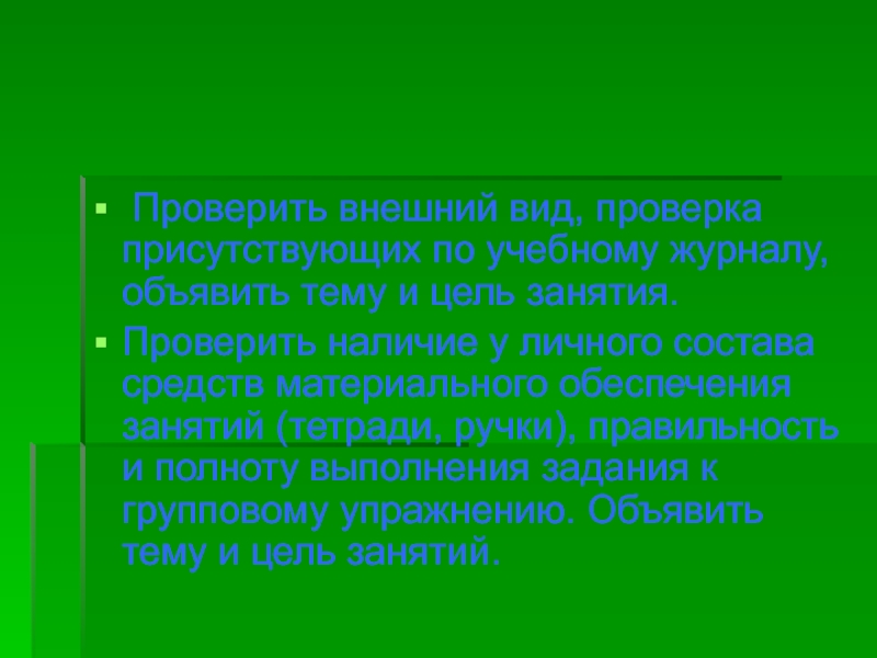 Проверить наличие у личного состава средств материального обеспечения занятий (тетради, ручки), правильность и полноту выполнения задания к групповому упражнению. Объявить тему и цель занятий.