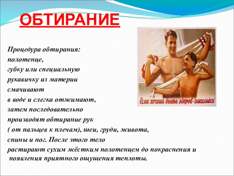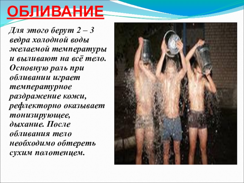 желаемой температуры и выливают на всё тело. Основную роль при обливании играет температурное раздражение кожи, рефлекторно оказывает тонизирующее, дыхание. После обливания тело необходимо обтереть сухим полотенцем.