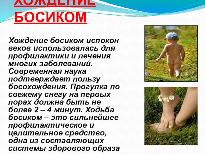 лечения многих заболеваний. Современная наука подтверждает пользу босохождения. Прогулка по свежему снегу на первых порах должна быть не более 2 – 4 минут. Ходьба босиком – это сильнейшее профилактическое и целительное средство, одна из составляющих системы здорового образа жизни.