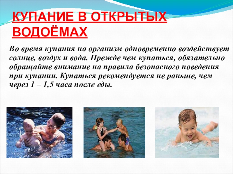 воздействует солнце, воздух и вода. Прежде чем купаться, обязательно обращайте внимание на правила безопасного поведения при купании. Купаться рекомендуется не раньше, чем через 1 – 1,5 часа после еды.