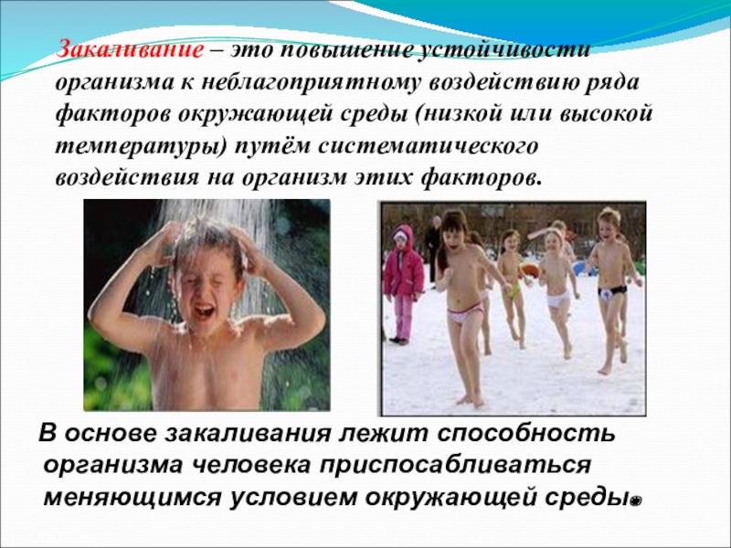 Слайд 6 Закаливание – это повышение устойчивости организма к неблагоприятному воздействию