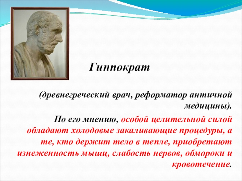 По его мнению, особой целительной силой обладают холодовые закаливающие процедуры, а те, кто держит тело в тепле, приобретают изнеженность мышц, слабость нервов, обмороки и кровотечение.