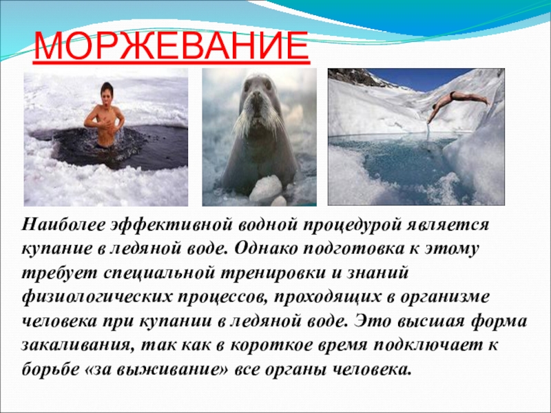 воде. Однако подготовка к этому требует специальной тренировки и знаний физиологических процессов, проходящих в организме человека при купании в ледяной воде. Это высшая форма закаливания, так как в короткое время подключает к борьбе «за выживание» все органы человека.