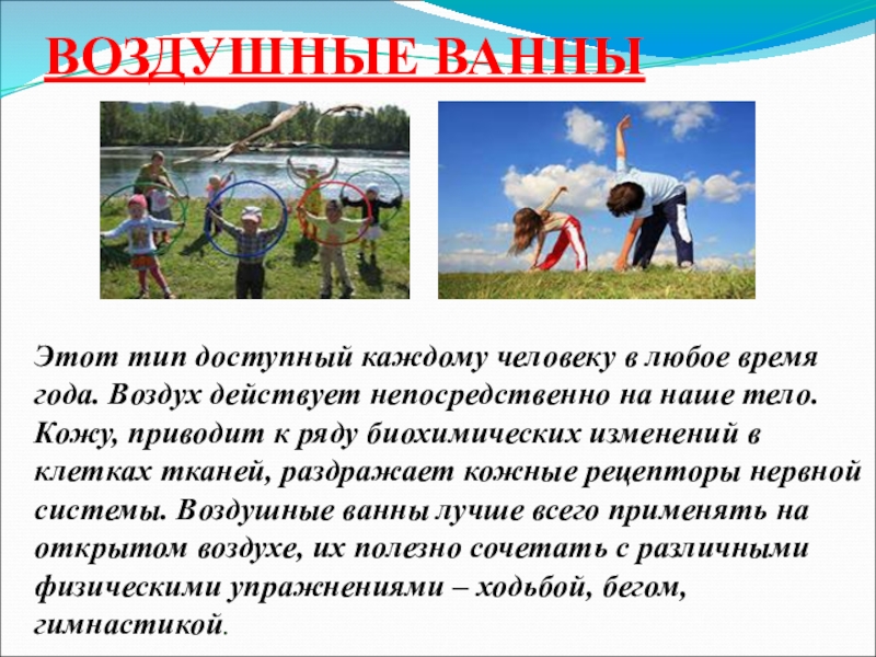 года. Воздух действует непосредственно на наше тело. Кожу, приводит к ряду биохимических изменений в клетках тканей, раздражает кожные рецепторы нервной системы. Воздушные ванны лучше всего применять на открытом воздухе, их полезно сочетать с различными физическими упражнениями – ходьбой, бегом, гимнастикой.