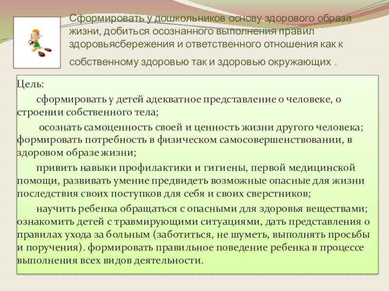научить ребенка обращаться с опасными для здоровья веществами; ознакомить детей с травмирующими ситуациями, дать представления о правилах ухода за больным (заботиться, не шуметь, выполнять просьбы и поручения). формировать правильное поведение ребенка в процессе выполнения всех видов деятельности.