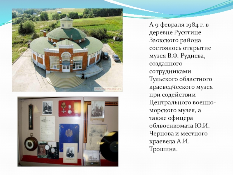 открытие музея В.Ф. Руднева, созданного сотрудниками Тульского областного краеведческого музея при содействии Центрального военно-морского музея, а также офицера облвоенкомата Ю.И. Чернова и местного краеведа А.И. Трошина.