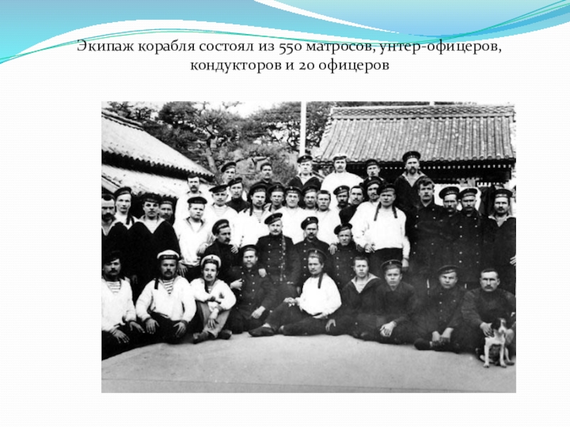 Слайд 7Экипаж корабля состоял из 550 матросов, унтер-офицеров, кондукторов и 20 офицеров