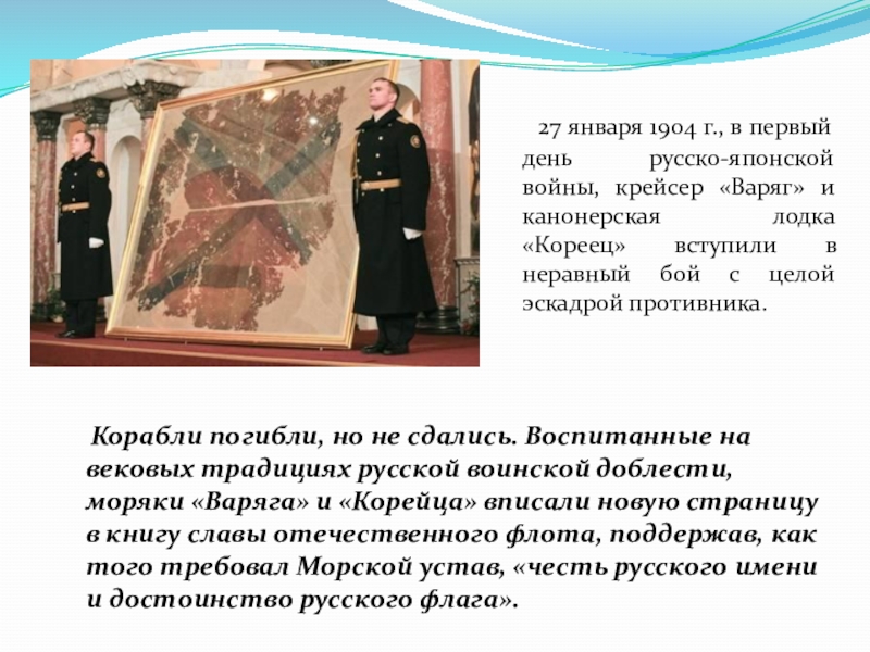 Корабли погибли, но не сдались. Воспитанные на вековых традициях русской воинской доблести, моряки «Варяга» и «Корейца» вписали новую страницу в книгу славы отечественного флота, поддержав, как того требовал Морской устав, «честь русского имени и достоинство русского флага».