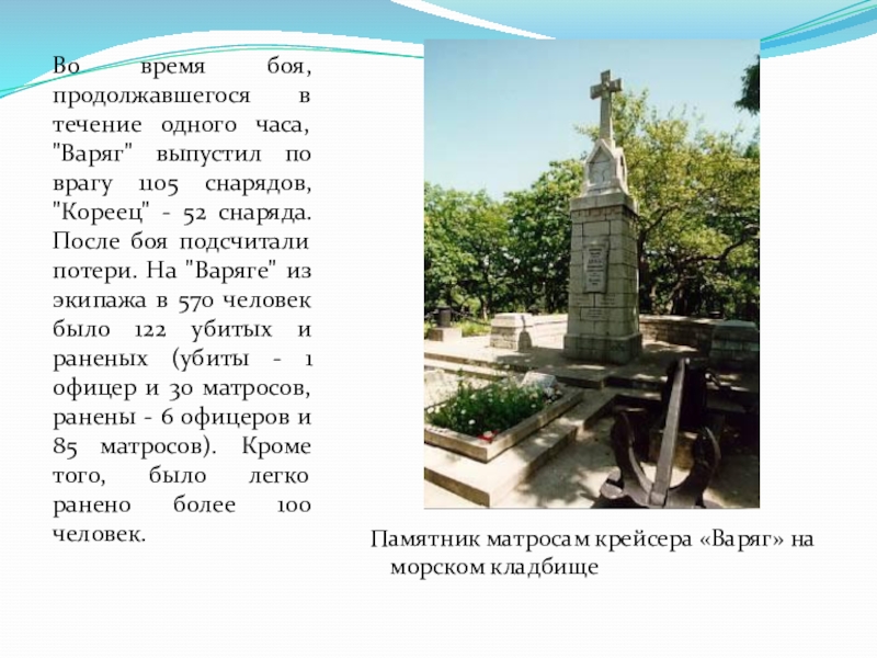 Слайд 17Во время боя, продолжавшегося в течение одного часа, "Варяг" выпустил по