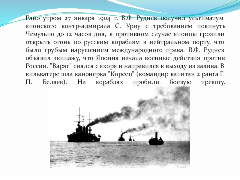 контр-адмирала С. Уриу с требованием покинуть Чемульпо до 12 часов дня, в противном случае японцы грозили открыть огонь по русским кораблям в нейтральном порту, что было грубым нарушением международного права. В.Ф. Руднев объявил экипажу, что Япония начала военные действия против России. "Варяг" снялся с якоря и направился к выходу из залива. В кильватере шла канонерка "Кореец" (командир капитан 2 ранга Г.П. Беляев). На кораблях пробили боевую тревогу.