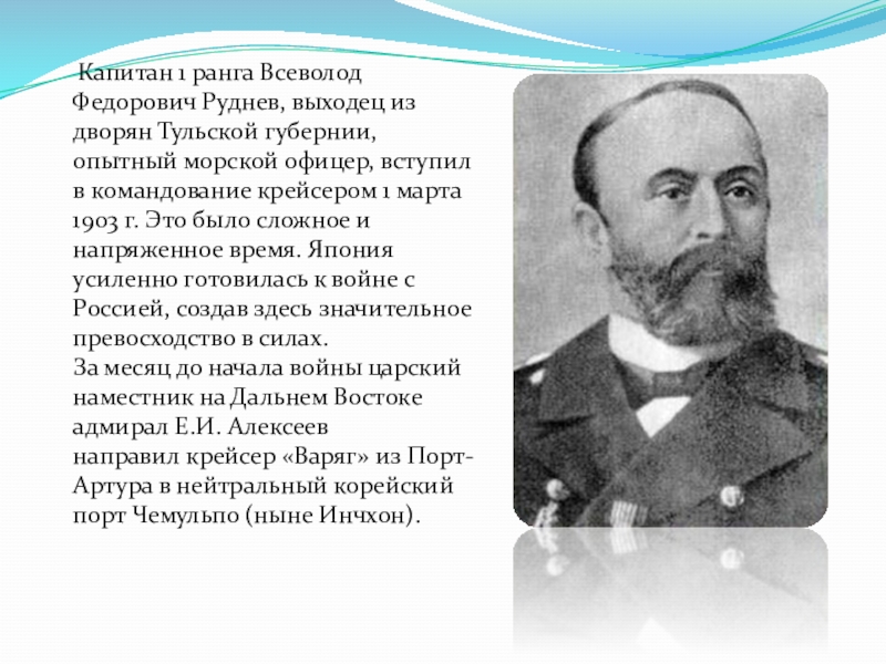 Слайд 9 Капитан 1 ранга Всеволод Федорович Руднев, выходец из дворян