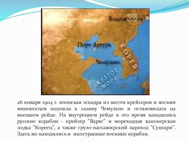 За месяц до начала войны царский наместник на Дальнем Востоке адмирал Е.И. Алексеев направил крейсер «Варяг» из Порт-Артура в нейтральный корейский порт Чемульпо (ныне Инчхон).