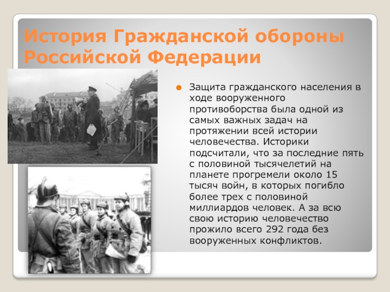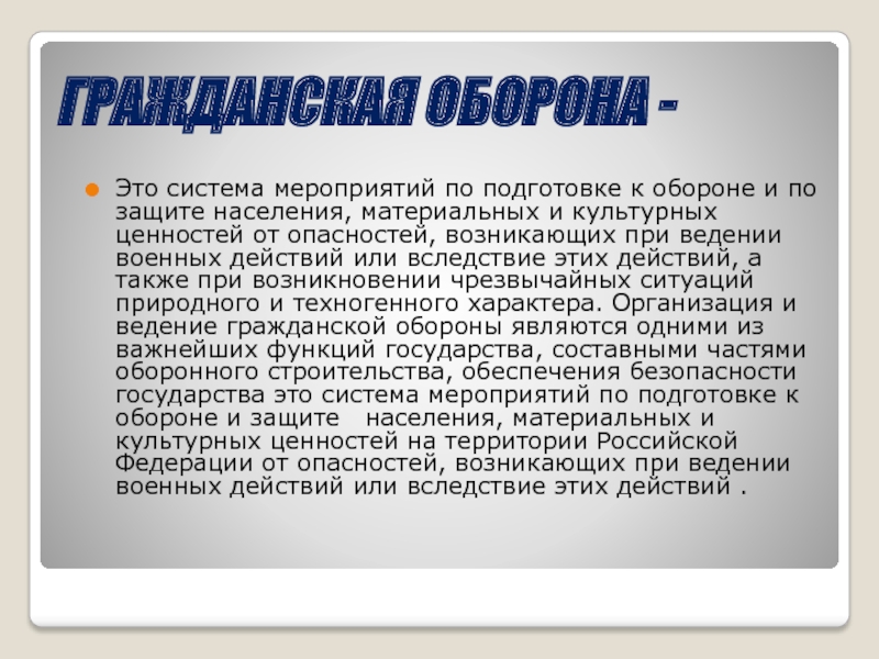 защите населения, материальных и культурных ценностей от опасностей, возникающих при ведении военных действий или вследствие этих действий, а также при возникновении чрезвычайных ситуаций природного и техногенного характера. Организация и ведение гражданской обороны являются одними из важнейших функций государства, составными частями оборонного строительства, обеспечения безопасности государства это система мероприятий по подготовке к обороне и защите населения, материальных и культурных ценностей на территории Российской Федерации от опасностей, возникающих при ведении военных действий или вследствие этих действий .