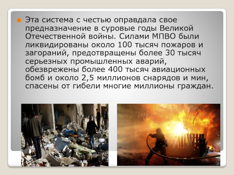 Отечественной войны. Силами МПВО были ликвидированы около 100 тысяч пожаров и загораний, предотвращены более 30 тысяч серьезных промышленных аварий, обезврежены более 400 тысяч авиационных бомб и около 2,5 миллионов снарядов и мин, спасены от гибели многие миллионы граждан.