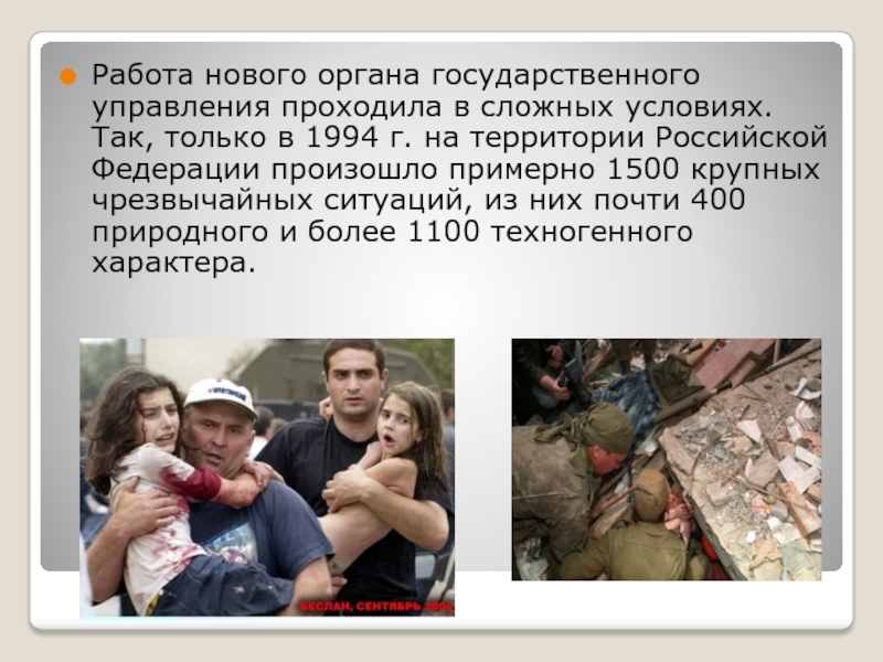 в 1994 г. на территории Российской Федерации произошло примерно 1500 крупных чрезвычайных ситуаций, из них почти 400 природного и более 1100 техногенного характера.