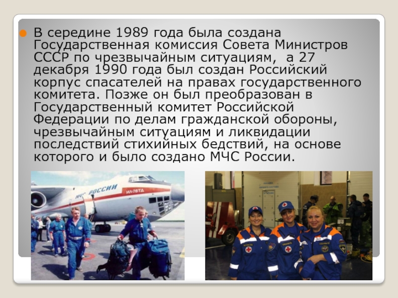 по чрезвычайным ситуациям, а 27 декабря 1990 года был создан Российский корпус спасателей на правах государственного комитета. Позже он был преобразован в Государственный комитет Российской Федерации по делам гражданской обороны, чрезвычайным ситуациям и ликвидации последствий стихийных бедствий, на основе которого и было создано МЧС России.