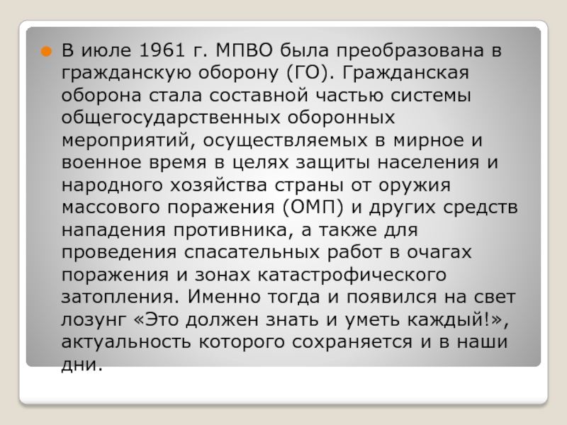 Слайд 12В июле 1961 г. МПВО была преобразована в гражданскую оборону (ГО).