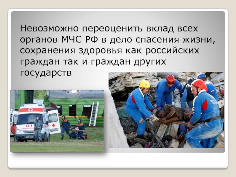 Слайд 19Невозможно переоценить вклад всех органов МЧС РФ в дело спасения жизни,