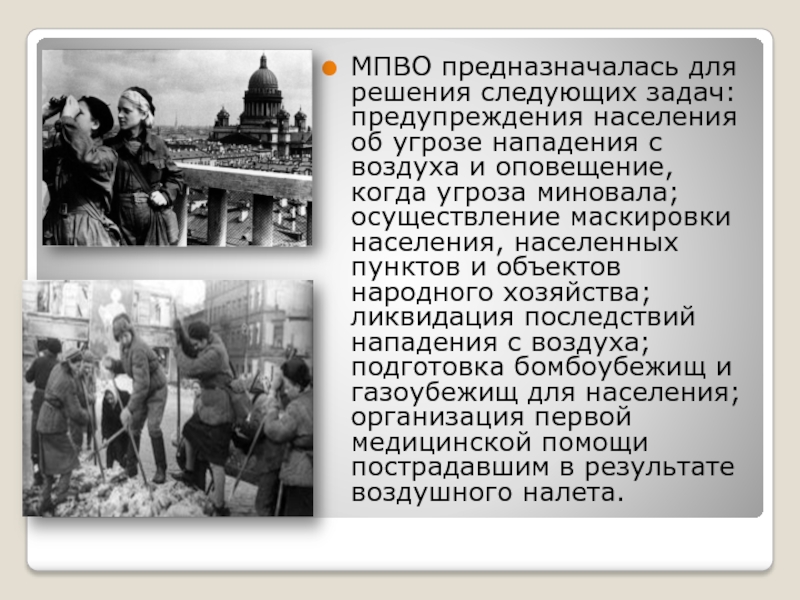 Слайд 6МПВО предназначалась для решения следующих задач: предупреждения населения об угрозе нападения