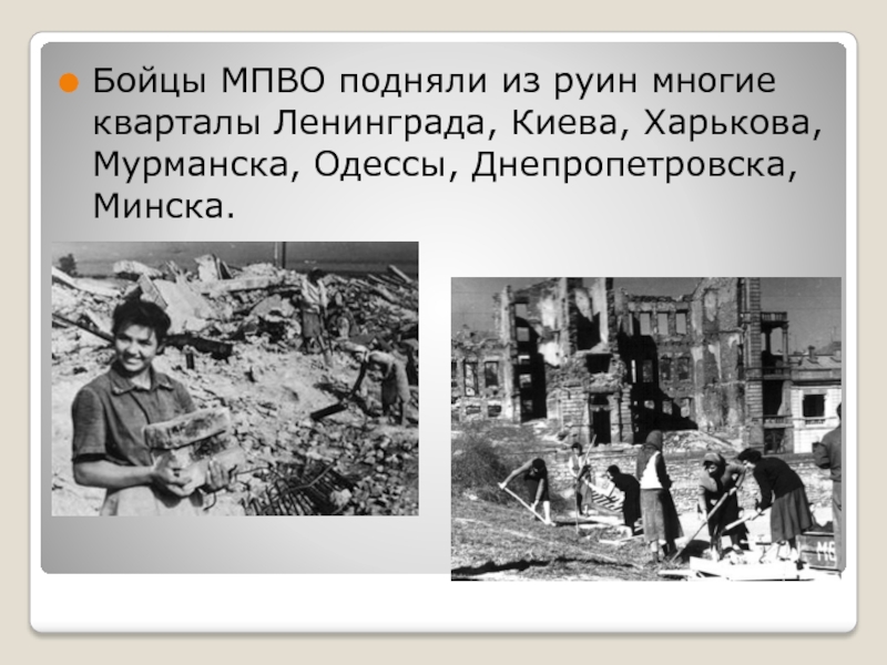 Слайд 9Бойцы МПВО подняли из руин многие кварталы Ленинграда, Киева, Харькова, Мурманска,