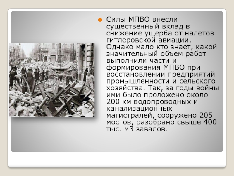 Слайд 8Силы МПВО внесли существенный вклад в снижение ущерба от налетов гитлеровской