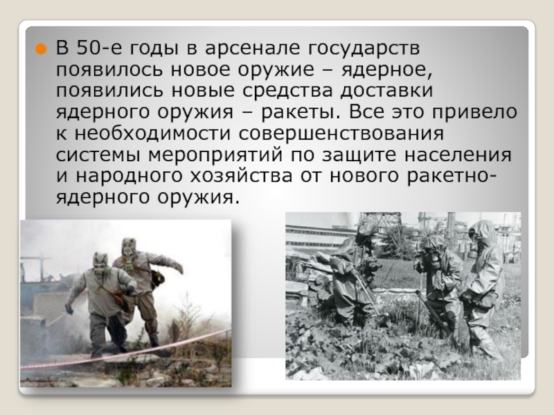появились новые средства доставки ядерного оружия – ракеты. Все это привело к необходимости совершенствования системы мероприятий по защите населения и народного хозяйства от нового ракетно-ядерного оружия.