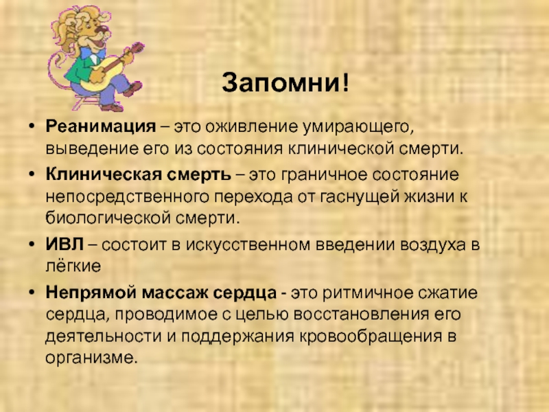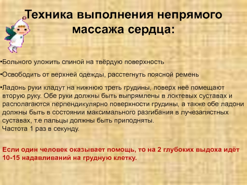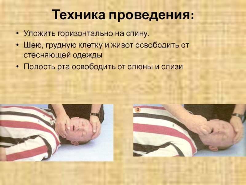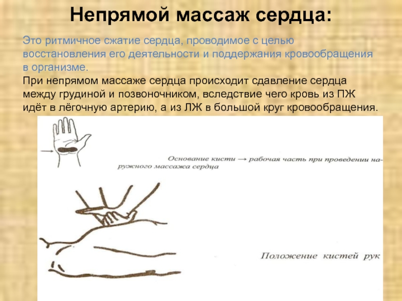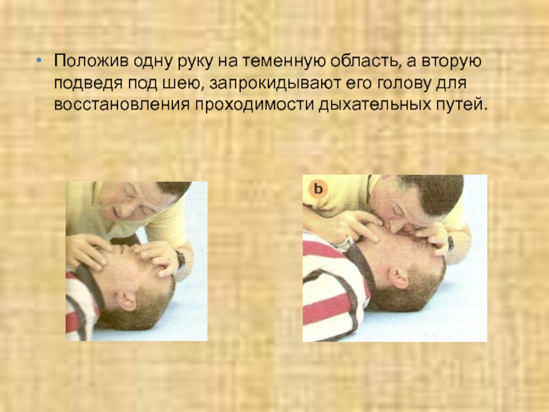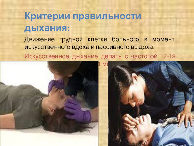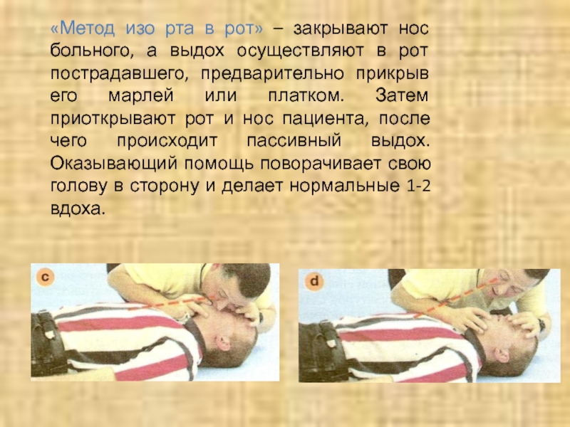 «Метод изо рта в рот» – закрывают нос больного, а выдох осуществляют в рот пострадавшего, предварительно прикрыв его марлей или платком. Затем приоткрывают рот и нос пациента, после чего происходит пассивный выдох. Оказывающий помощь поворачивает свою голову в сторону и делает нормальные 1-2 вдоха.