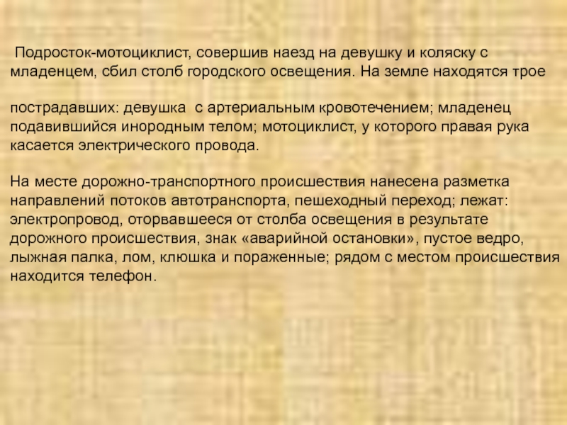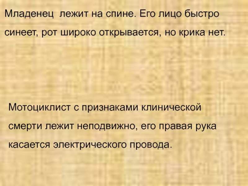 Мотоциклист с признаками клинической смерти лежит неподвижно, его правая рука касается электрического провода.