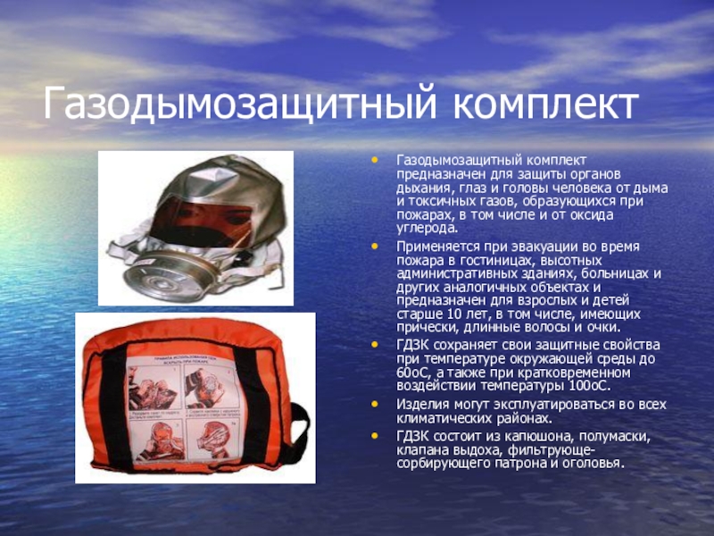 Газодымозащитный комплектГазодымозащитный комплект предназначен для защиты органов дыхания, глаз и головы человека от дыма и токсичных газов,