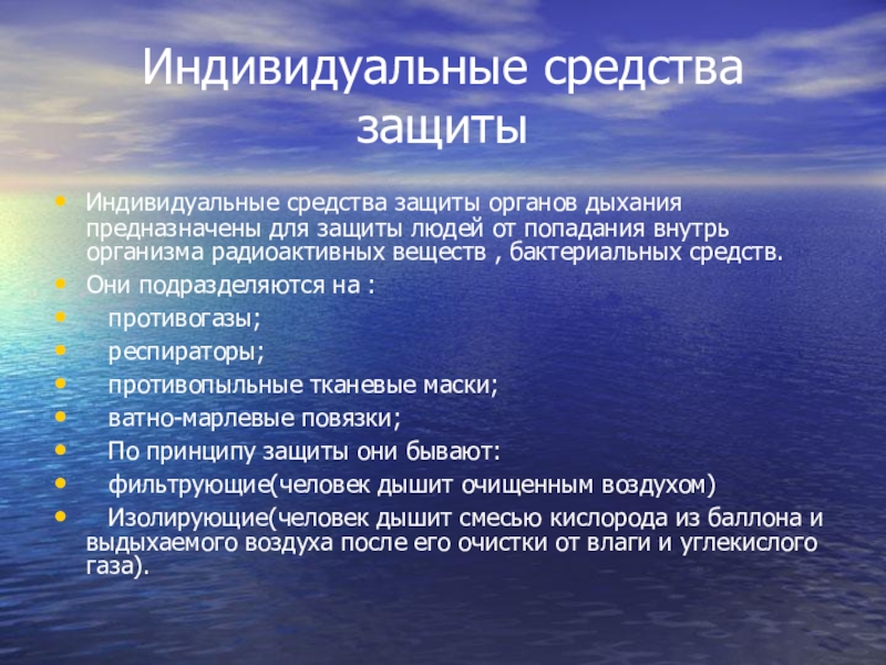 Индивидуальные средства защитыИндивидуальные средства защиты органов дыхания предназначены для защиты людей от попадания внутрь организма радиоактивных веществ , бактериальных средств.Они подразделяются на : противогазы; респираторы; противопыльные тканевые маски; ватно-марлевые повязки; По
