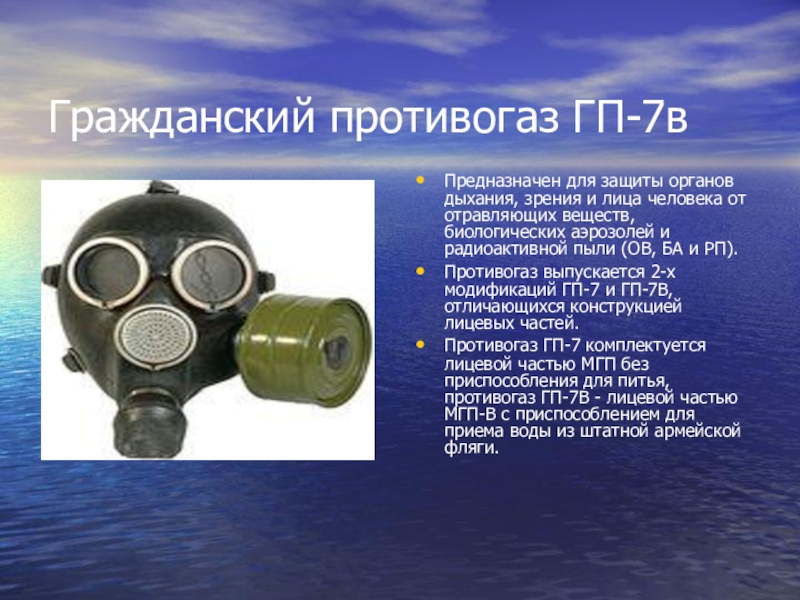 Гражданский противогаз ГП-7вПредназначен для защиты органов дыхания, зрения и лица человека от отравляющих веществ, биологических аэрозолей и
