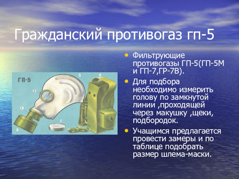 Гражданский противогаз гп-5Фильтрующие противогазы ГП-5(ГП-5М и ГП-7,ГР-7В).Для подбора необходимо измерить голову по замкнутой линии ,проходящей через макушку