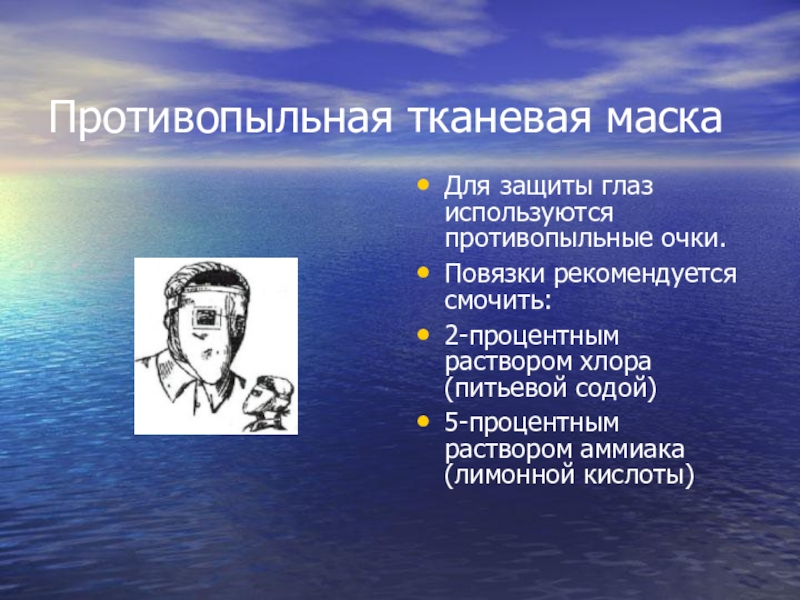 Противопыльная тканевая маскаДля защиты глаз используются противопыльные очки.Повязки рекомендуется смочить:2-процентным раствором хлора(питьевой содой)5-процентным раствором аммиака(лимонной кислоты)
