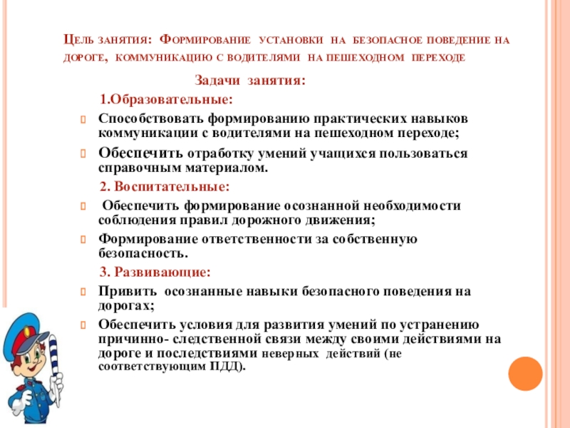 Способствовать формированию практических навыков коммуникации с водителями на пешеходном переходе;