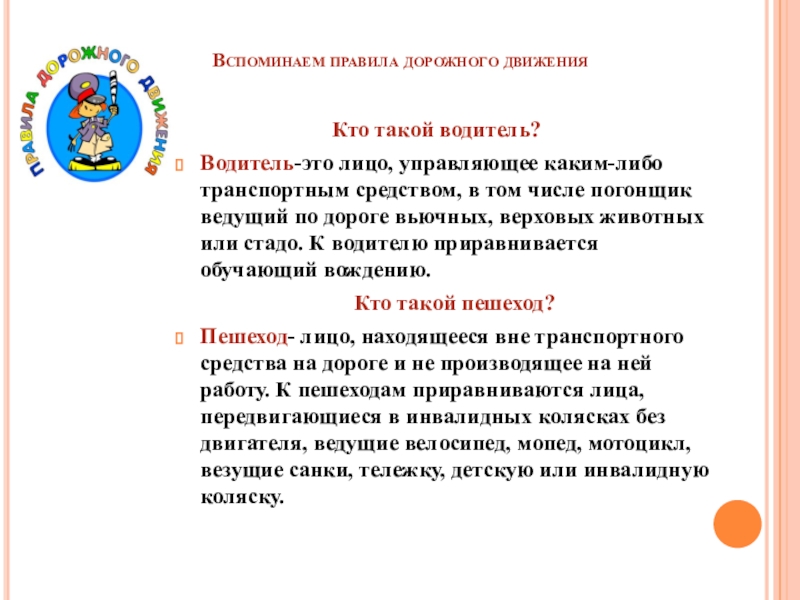 Водитель-это лицо, управляющее каким-либо транспортным средством, в том числе погонщик ведущий по дороге вьючных, верховых животных или стадо. К водителю приравнивается обучающий вождению.