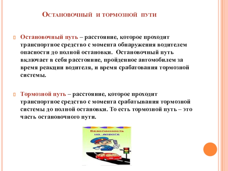 Тормозной путь – расстояние, которое проходит транспортное средство с момента срабатывания тормозной системы до полной остановки. То есть тормозной путь – это часть остановочного пути.