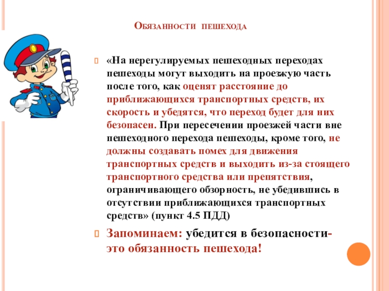 «На нерегулируемых пешеходных переходах пешеходы могут выходить на проезжую часть после того, как оценят расстояние до приближающихся транспортных средств, их скорость и убедятся, что переход будет для них безопасен. При пересечении проезжей части вне пешеходного перехода пешеходы, кроме того, не должны создавать помех для движения транспортных средств и выходить из-за стоящего транспортного средства или препятствия, ограничивающего обзорность, не убедившись в отсутствии приближающихся транспортных средств» (пункт 4.5 ПДД)