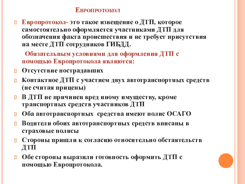 Обязательным условиями для оформления ДТП с помощью Европротокола являются: