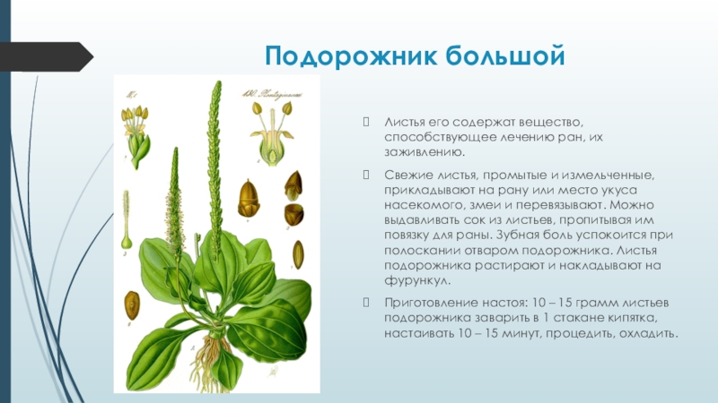 Приготовление настоя: 10 – 15 грамм листьев подорожника заварить в 1 стакане кипятка, настаивать 10 – 15 минут, процедить, охладить.