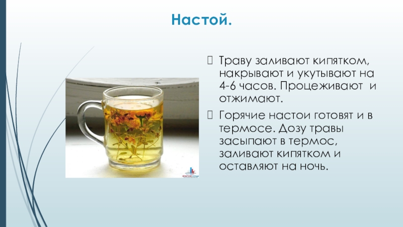 Горячие настои готовят и в термосе. Дозу травы засыпают в термос, заливают кипятком и оставляют на ночь.