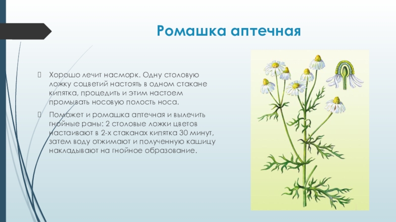 Поможет и ромашка аптечная и вылечить гнойные раны: 2 столовые ложки цветов настаивают в 2-х стаканах кипятка 30 минут, затем воду отжимают и полученную кашицу накладывают на гнойное образование.