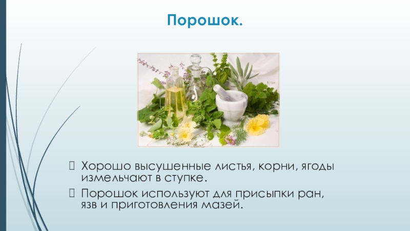 Хорошо высушенные листья, корни, ягоды измельчают в ступке.