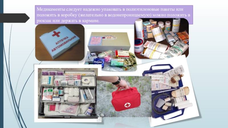 Слайд 8Медикаменты следует надежно упаковать в полиэтиленовые пакеты или положить в коробку
