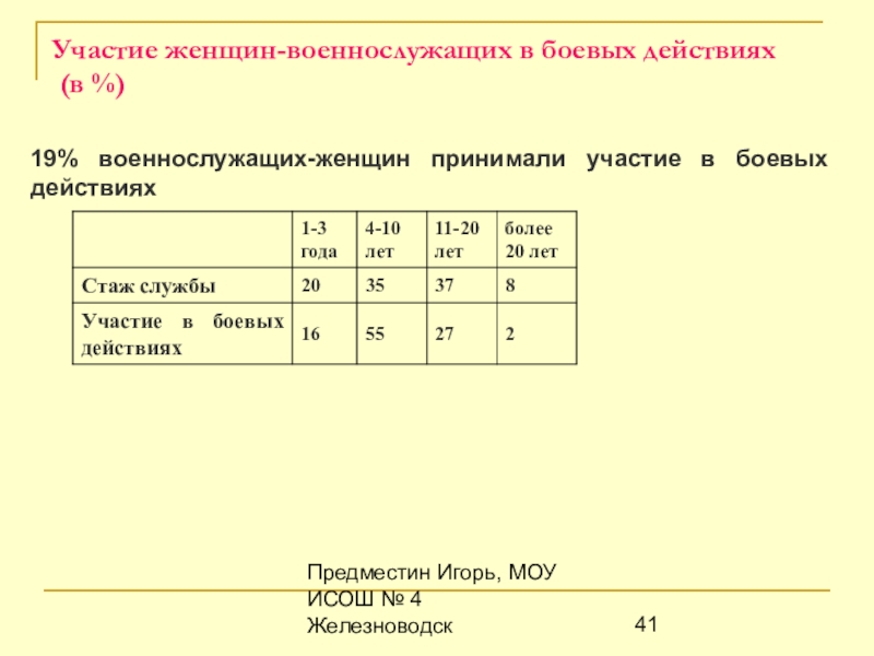 19% военнослужащих-женщин принимали участие в боевых действиях