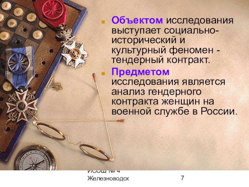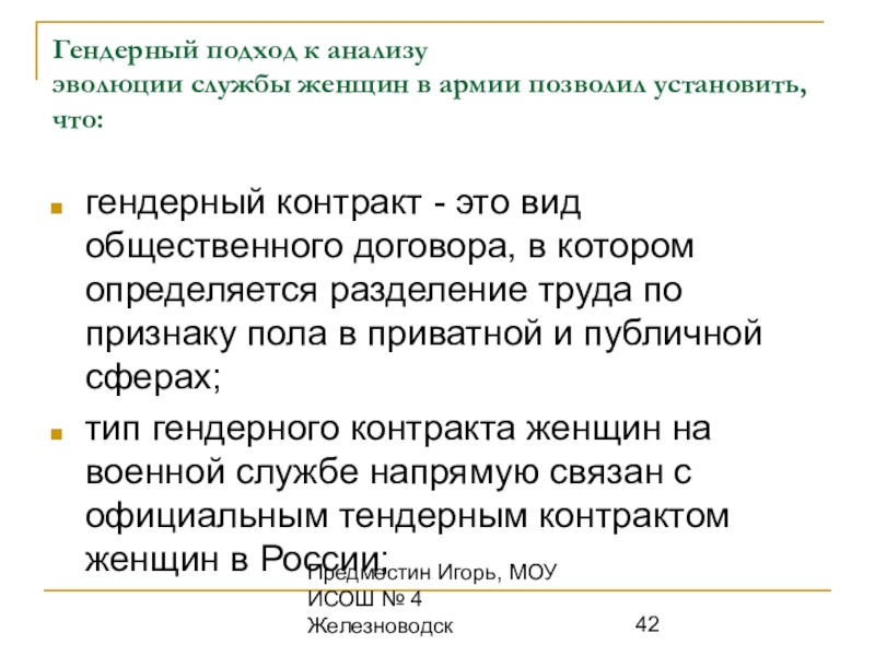 Предметом исследования является анализ гендерного контракта женщин на военной службе в России.
