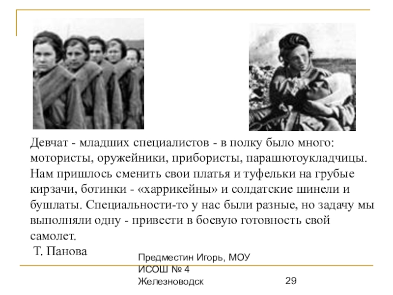 в полку было много: мотористы, оружейники, прибористы, парашютоукладчицы. Нам пришлось сменить свои платья и туфельки на грубые кирзачи, ботинки - «харрикейны» и солдатские шинели и бушлаты. Специальности-то у нас были разные, но задачу мы выполняли одну - привести в боевую готовность свой самолет.